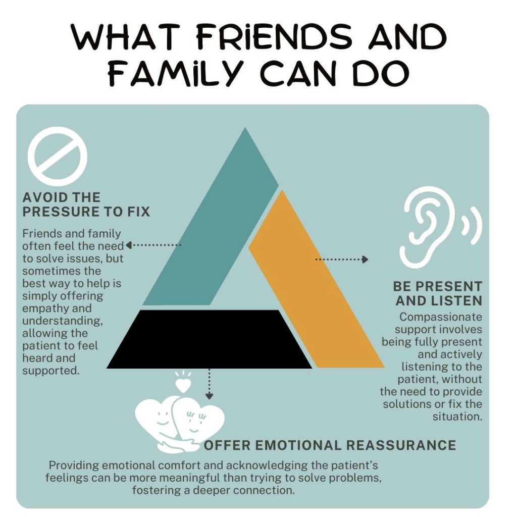 Managing these emotional challenges requires intentional support. Joining support groups allows patients and families to share experiences and reduce feelings of isolation (4). Counseling and therapy provide tools for processing grief and uncertainty, offering a safe space to express emotions without judgment (1)(4). Maintaining family connection through open conversations and shared activities helps preserve relationships during treatment (5). Mindfulness practices, journaling, and stress-reduction techniques can also strengthen emotional resilience and help individuals regain a sense of control (4). These strategies not only improve emotional well-being but can also enhance treatment outcomes by reducing stress and promoting hope.